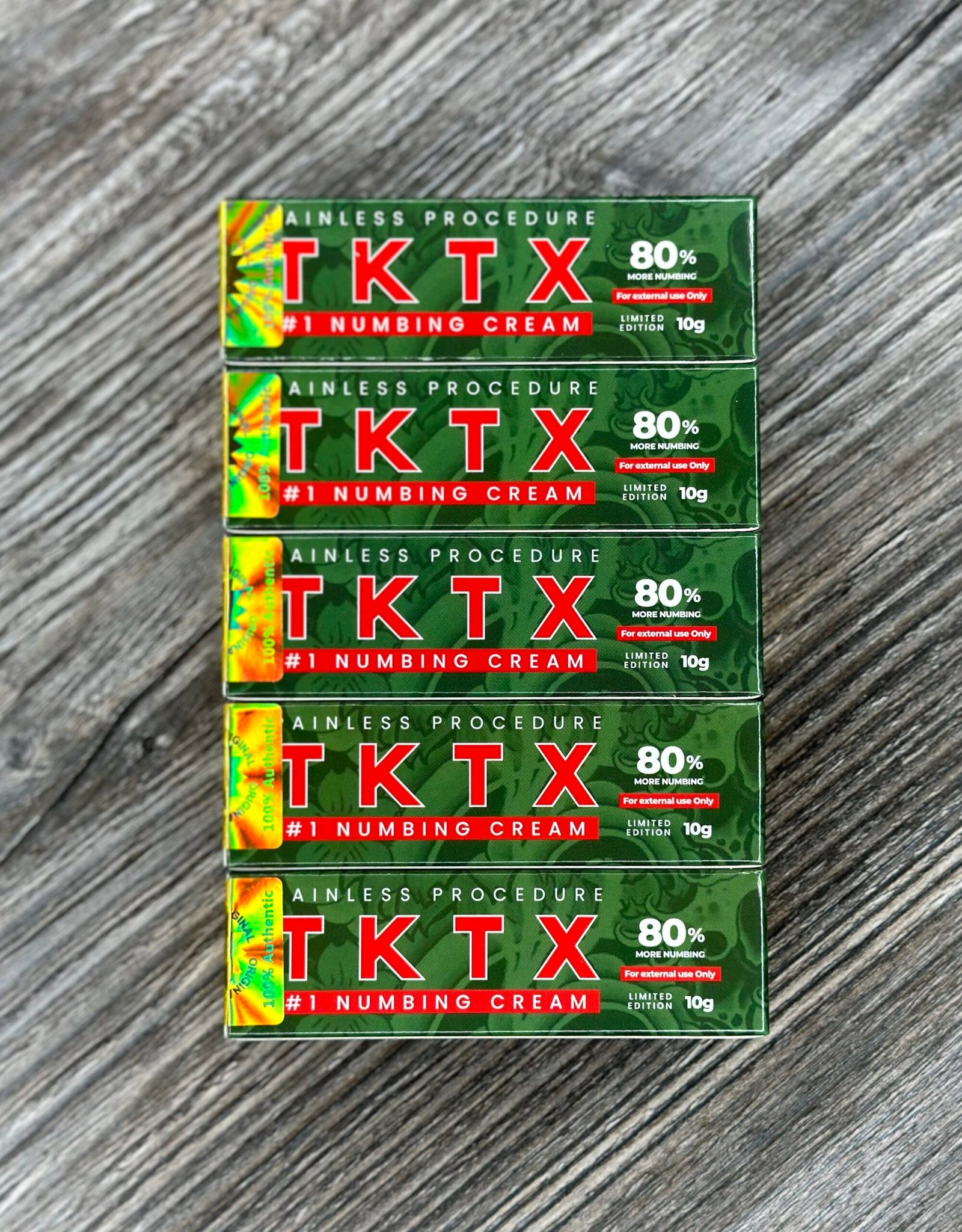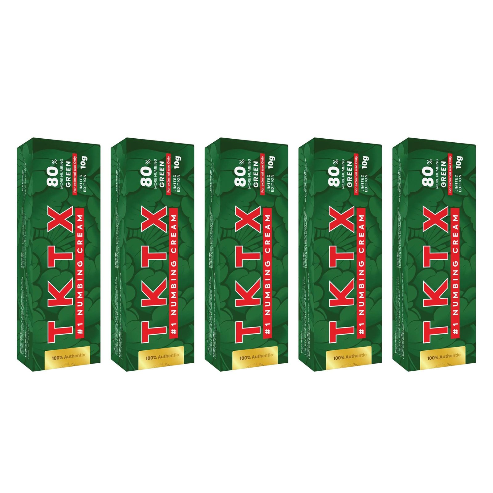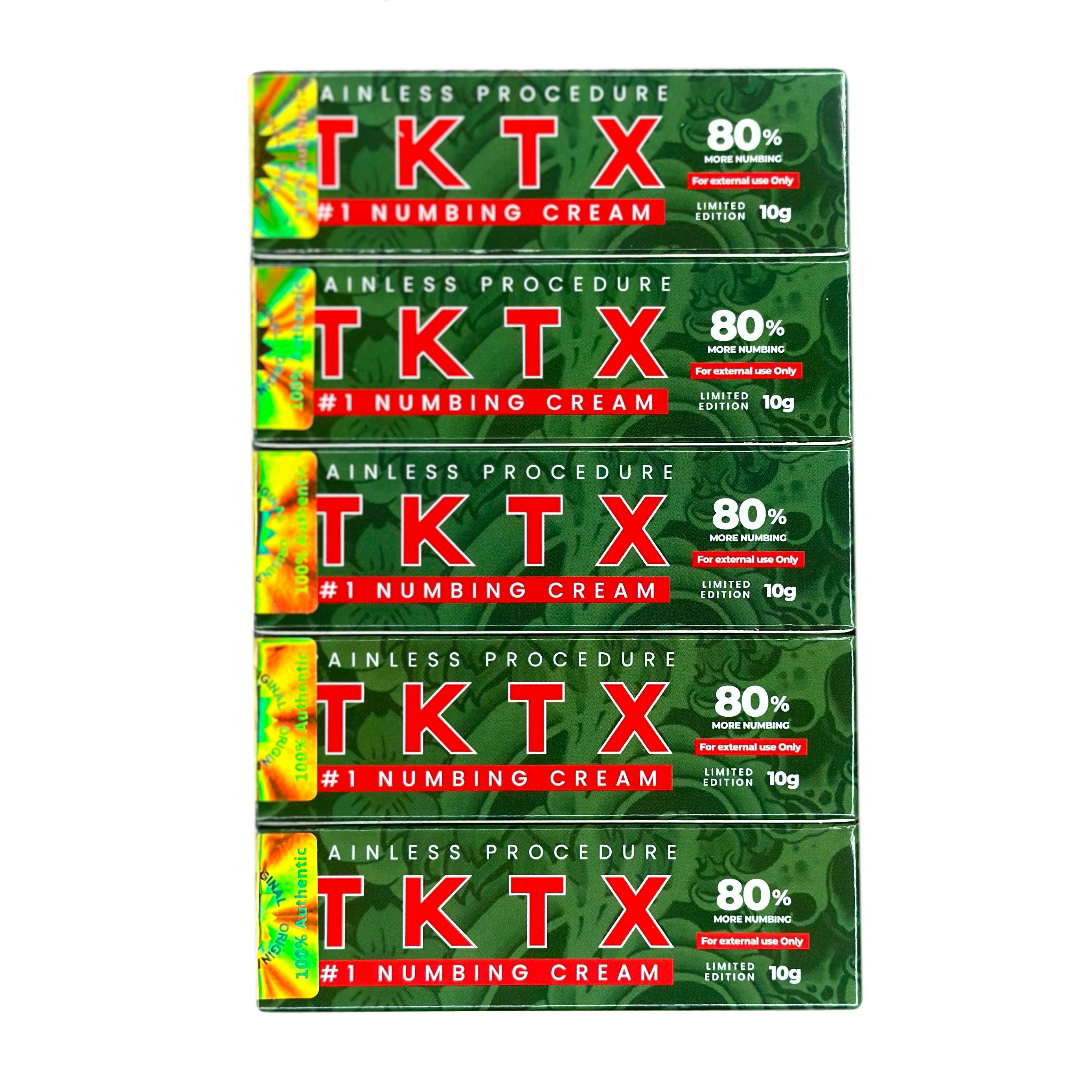 TKTX Numbing Cream Green 80% – 5 Pack is designed for individuals and professionals who want reliable comfort support during tattoos and cosmetic skin procedures. Each pack includes five 10g tubes, providing enough product for larger treatment areas, multiple sessions, or professional studio use.
