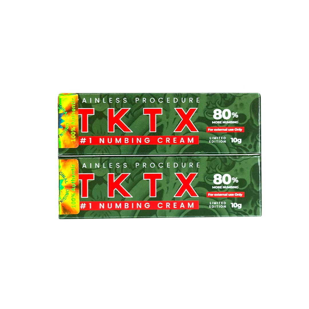 TKTX Numbing Cream Green 80% – 2 Pack is designed for individuals and professionals who need dependable comfort support during tattoos and cosmetic procedures. Each tube contains 10g of fast-acting numbing cream, giving you extra coverage for larger areas, longer sessions, or multiple treatments.